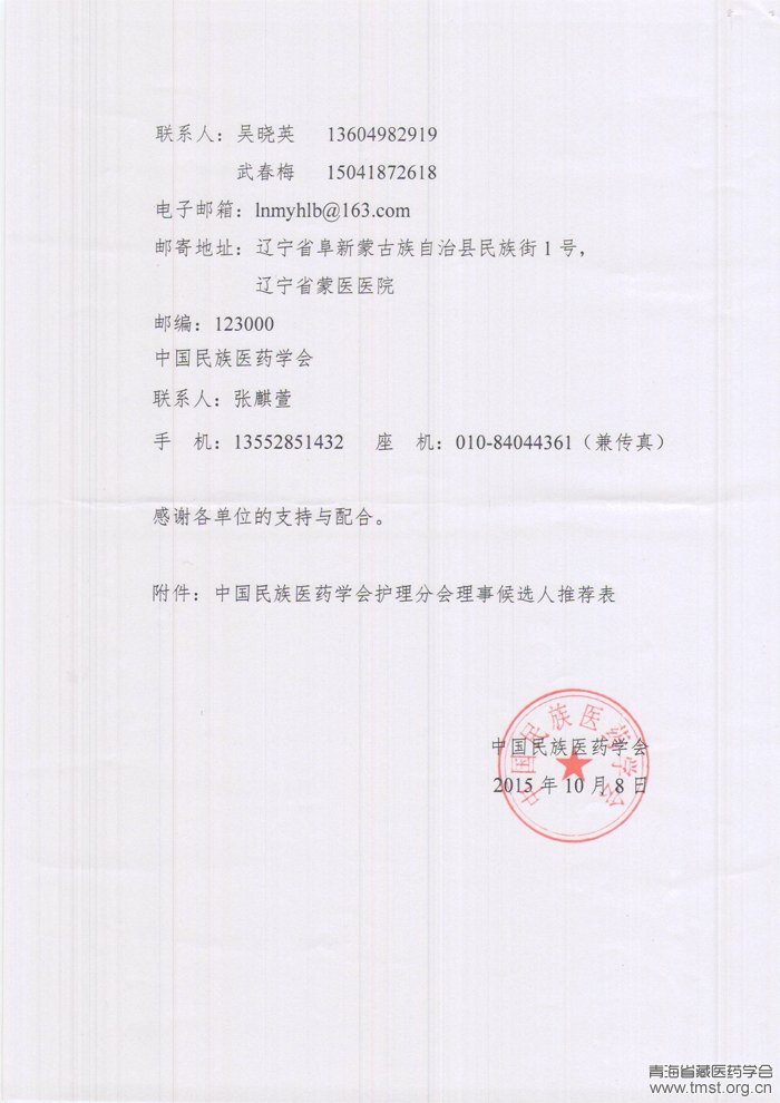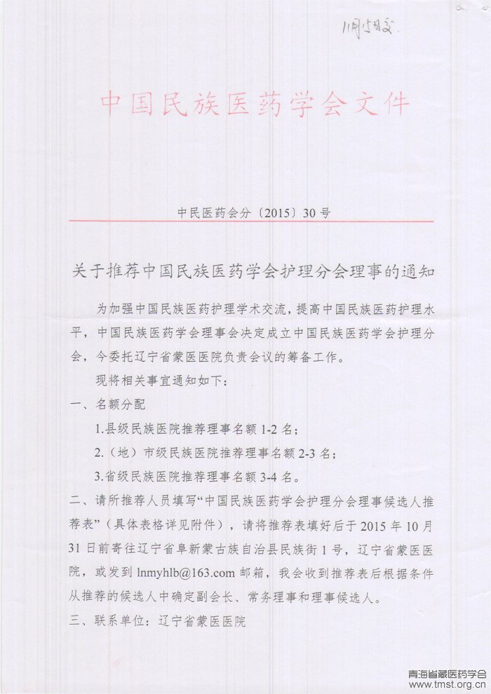 为加强中国民族医药护理学术交流,提高中国民族医药护理水平,中国民族医药学会理事会决定成立中国民族医药学会护理分会,现将中国民族医药学会“关于推荐中国民族医药学会护理分会理事”的通知转发给你们,请各有关单位积极推荐。