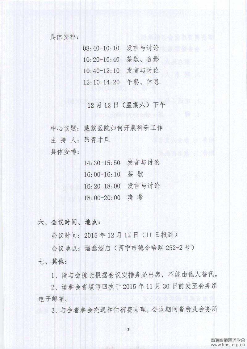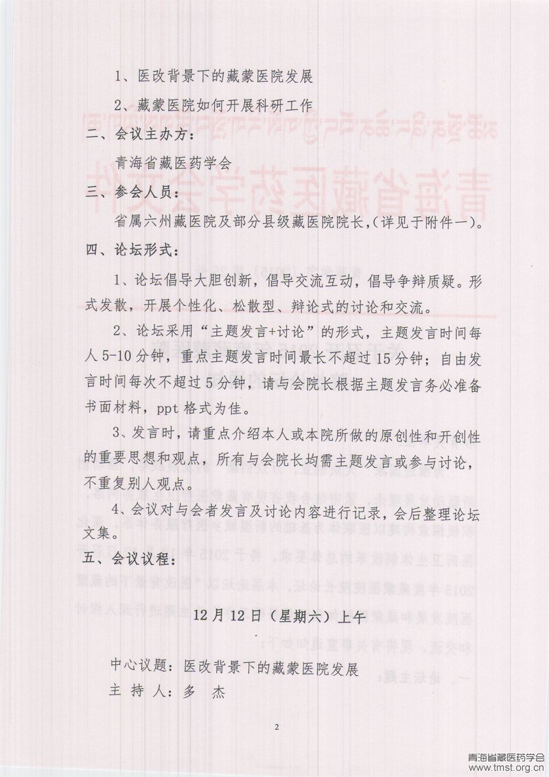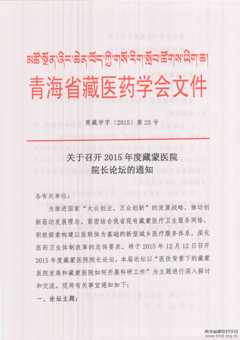 为推进国家“大众创业,万众创新”的发展战略,推动创新驱动发展理念,紧密结合我省现有藏蒙医疗卫生服务网络,积极探索构建以医联体为基础的新型城乡医疗服务体系,深化医药卫生体制改革的总体要求,将于2015年12月12日召开2015年度藏蒙医院院长论坛,本届论坛以“医改背景下的藏蒙医院发展和藏蒙医院如何开展科研工作”为主题进行深入探讨和交流。现将有关事宜通知如下:
